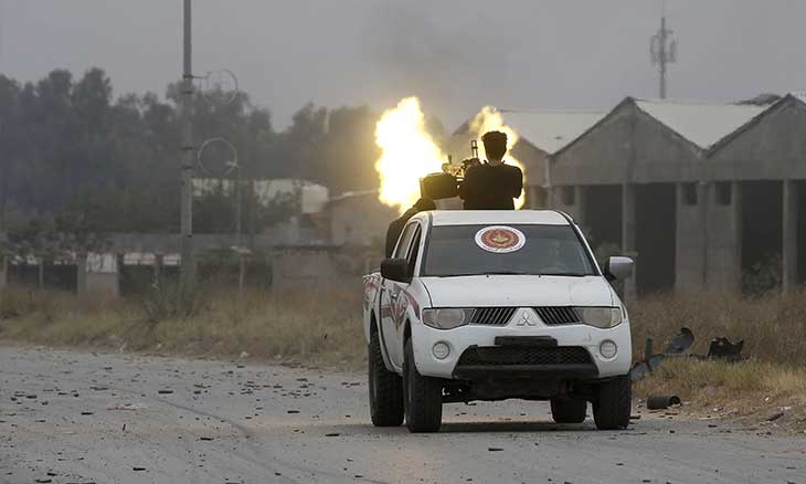 وعلى الصعيد العسكري، استمرت أمس وأول أمس الاشتباكات المتقطعة في الضواحي الجنوبية للعاصمة طرابلس، وخاصة العزيزية، وسقطت بعض الصواريخ على منطقة الهيرة. وأفاد مصدر عسكري أن المناطق التي تسيطر عليها قوات حكومة الوفاق هي الساعدية وجسر الزهراء والعزيزية والسواني، أما المناطق الخاضعة لقوات حفتر فهي الهيرة واسبيعة والطويشة وقصر بن غشير ومطار طرابلس الدولي المقفل منذ قرابة خمس سنوات.